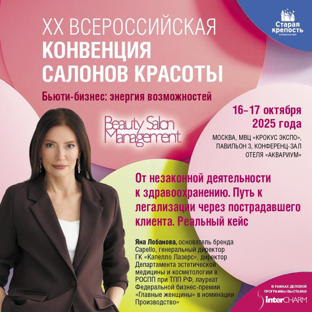 В рамках XX Всероссийской конвенции для салонов красоты, Яна Дмитриевна Лобанова прочла доклад на тему «От незаконной деятельности к здравоохранению. Путь к легализации через пострадавшего клиента. Реальный кейс»